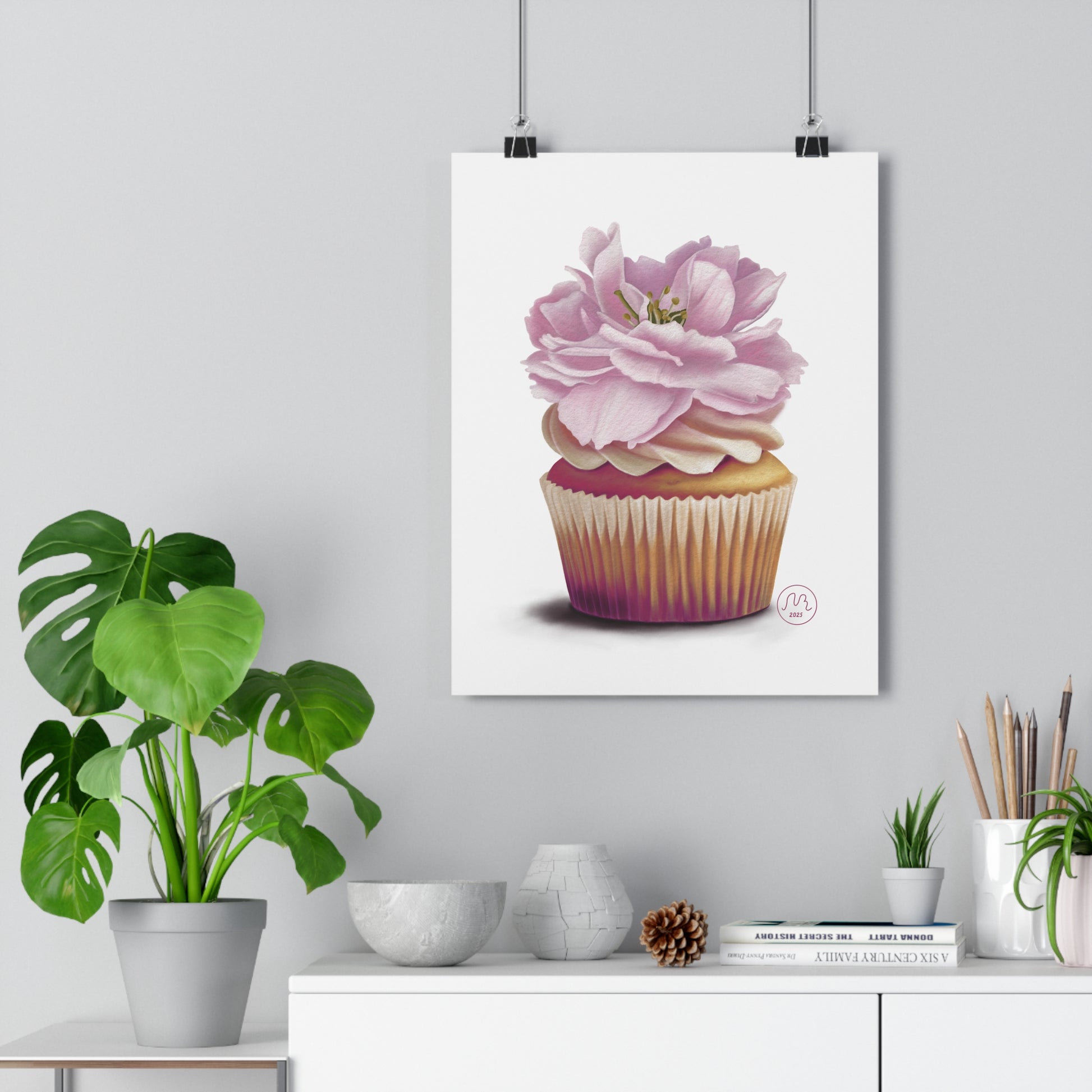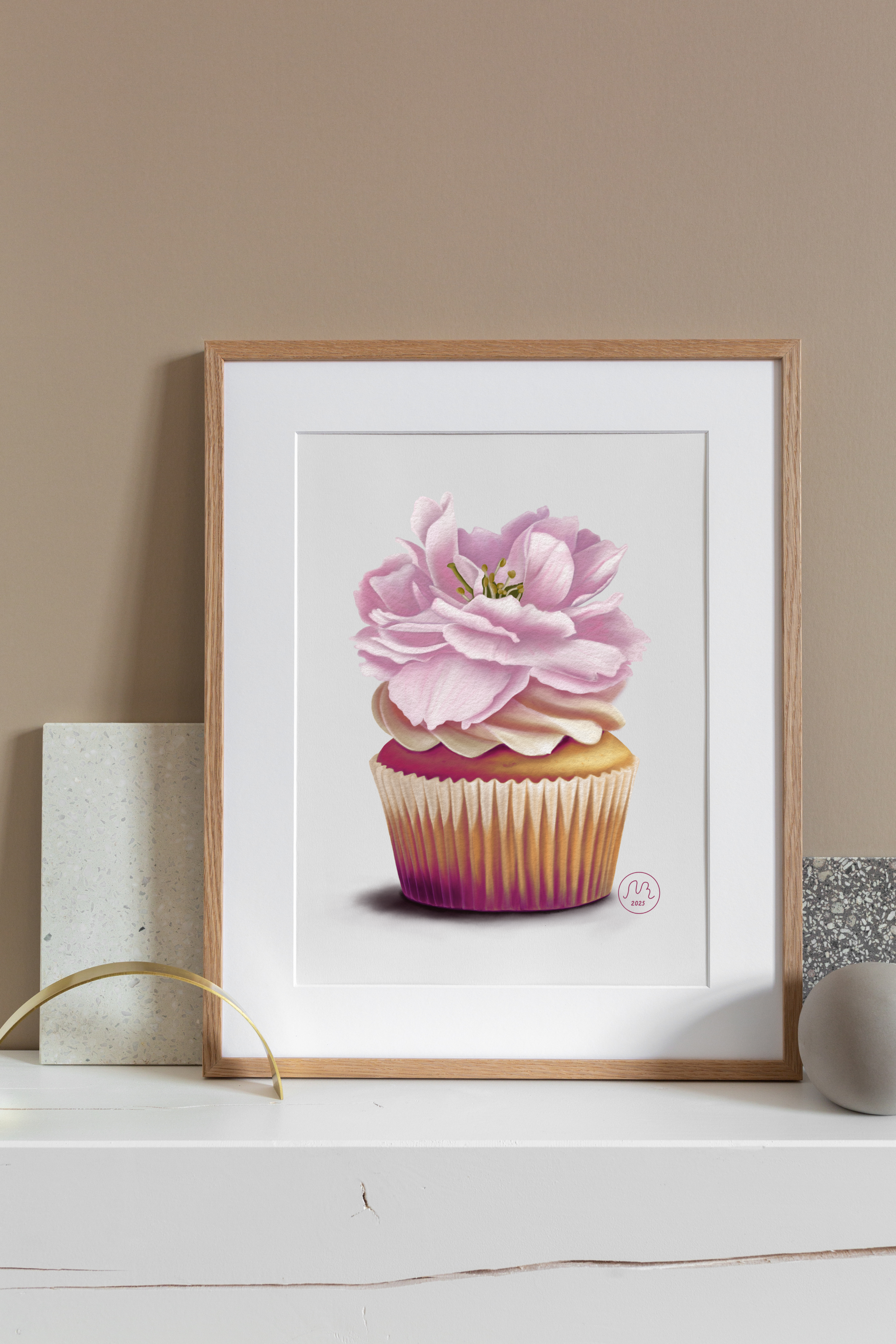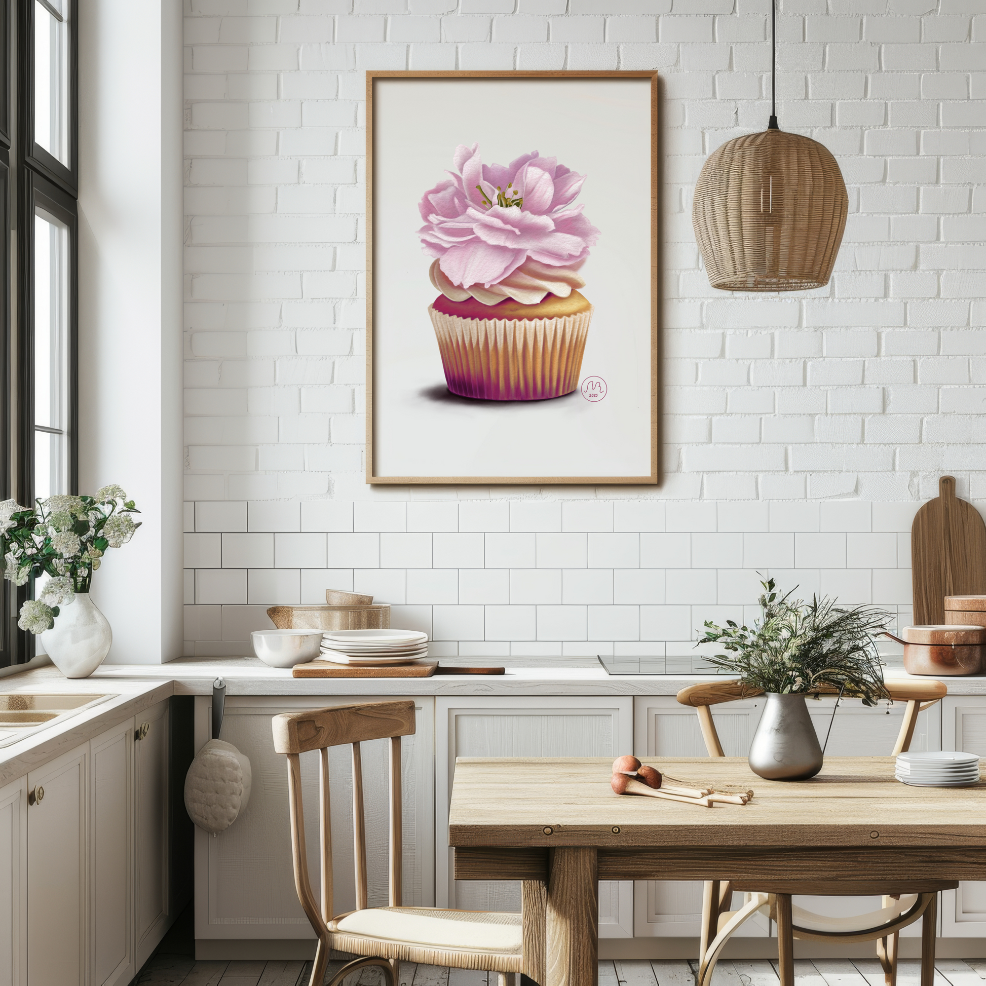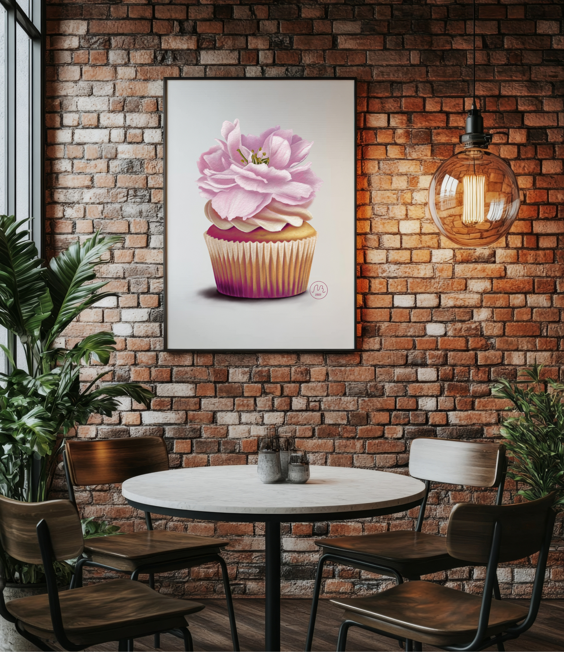 Perfect for kitchens, nurseries, creative studios, or anyone who loves floral fantasy and gentle pastel tones. This artwork adds a unique touch to gallery walls or makes a thoughtful gift for nature lovers, flower enthusiasts, or cupcake fans alike.
