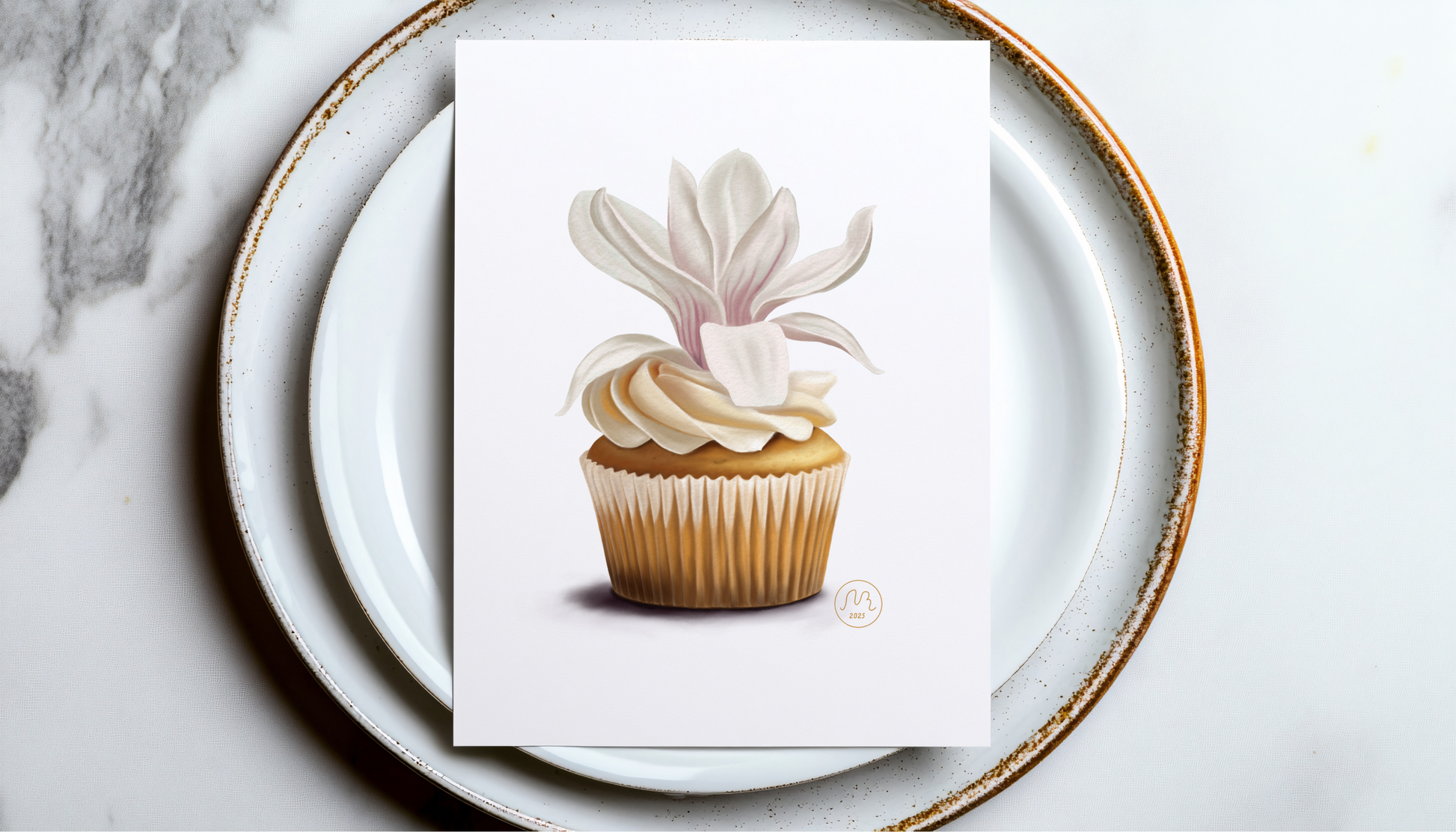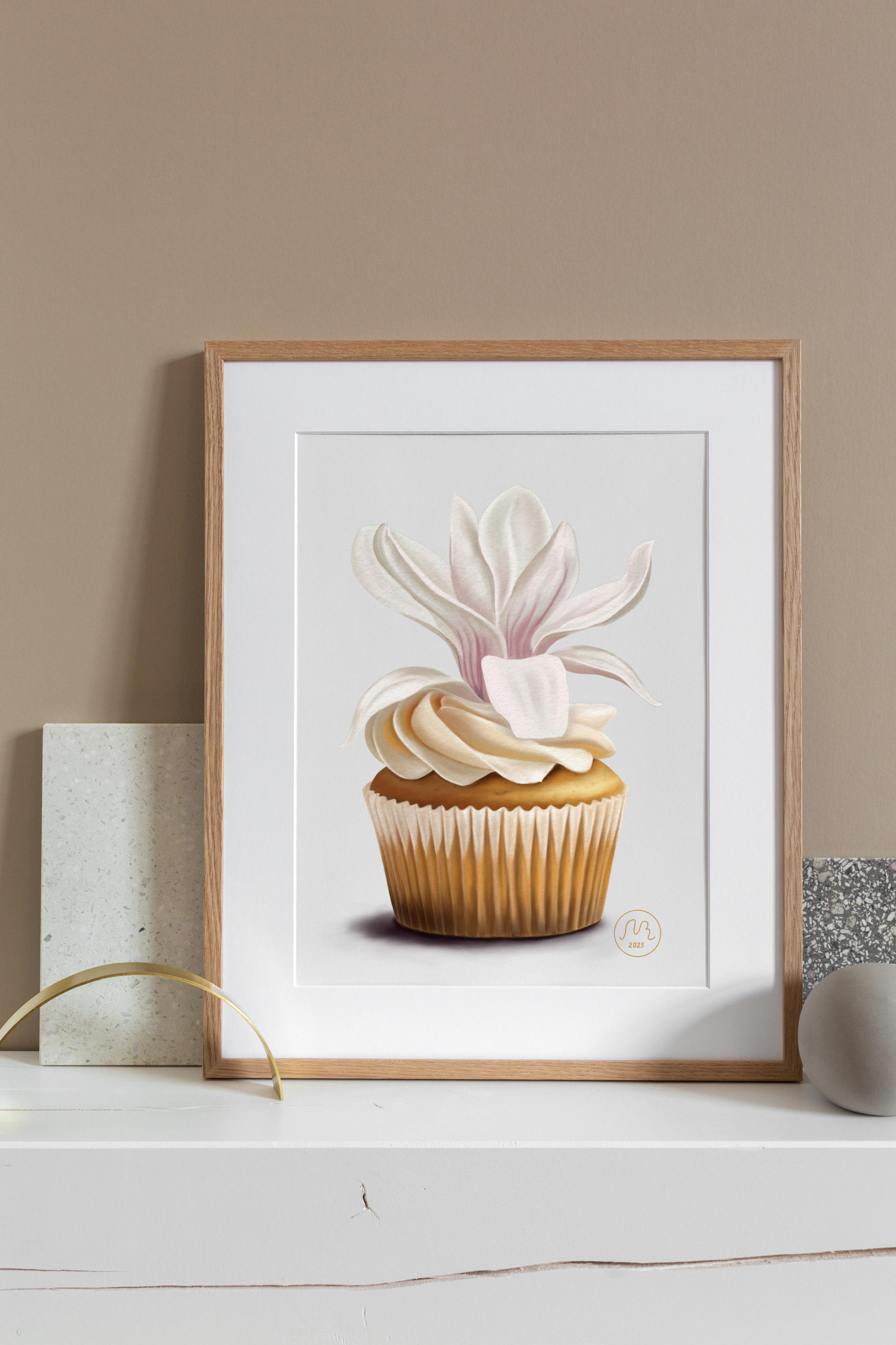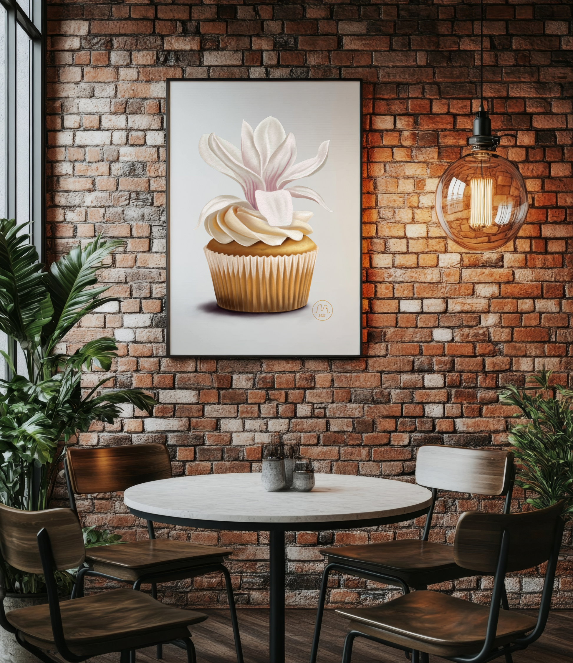 Let your walls bloom with sweetness and charm! This Magnolia Cupcake Art Print is a whimsical fusion of nature and dessert, bringing a soft, dreamy vibe to any space. A delicate magnolia blossom takes the place of icing, resting atop a golden cupcake base — a surreal design that celebrates imagination and beauty.