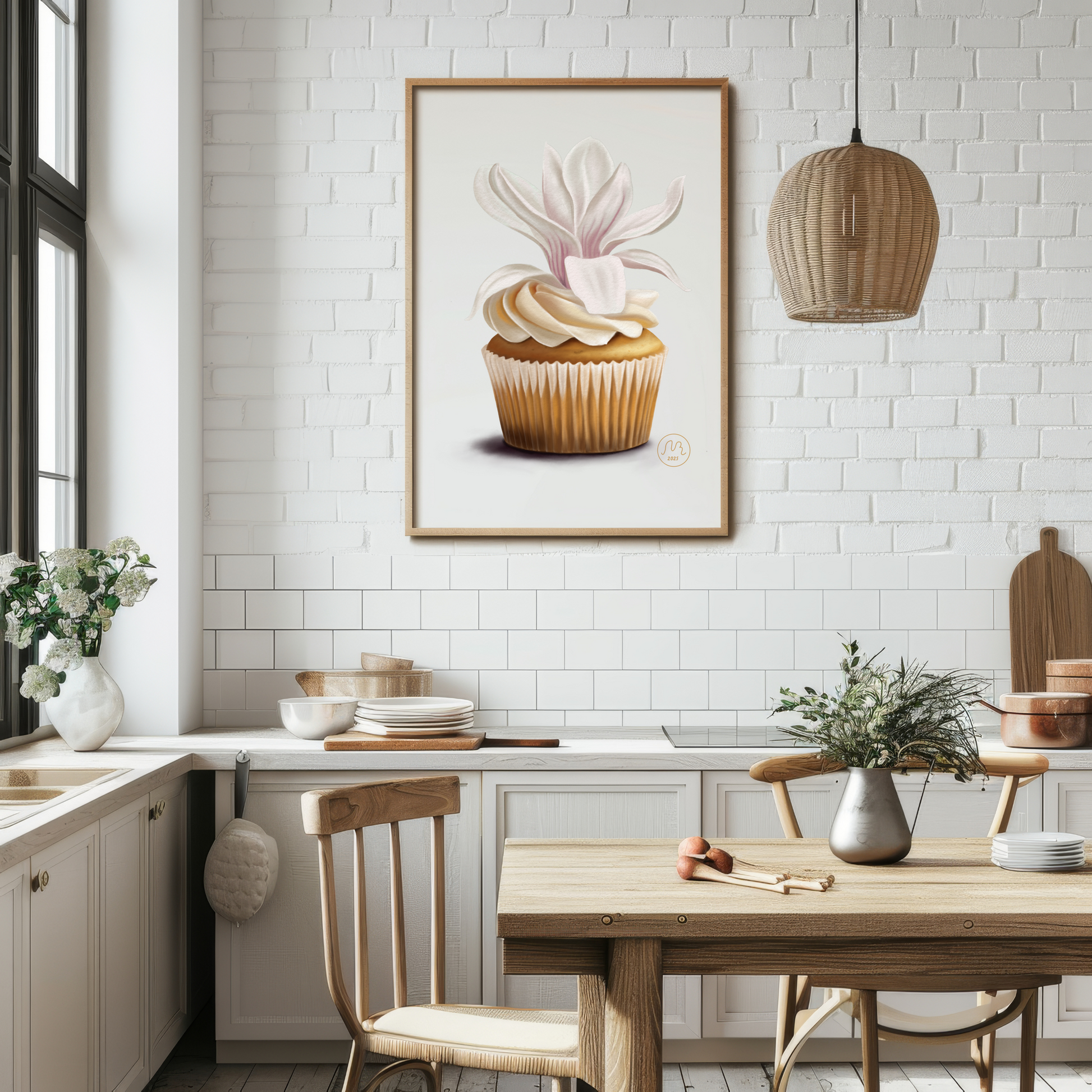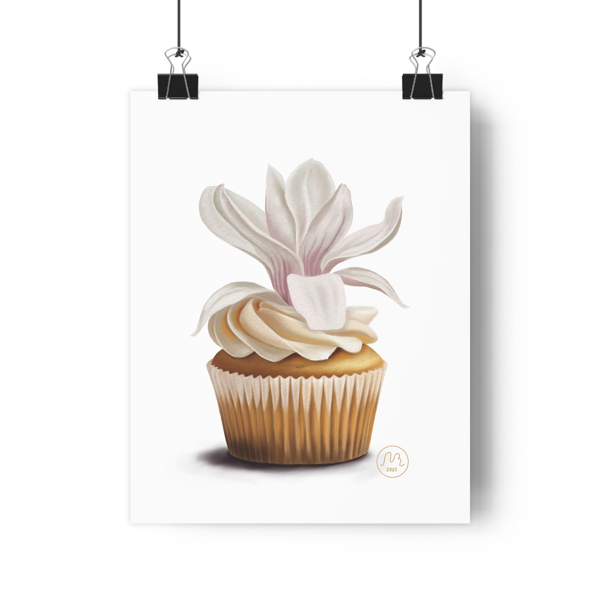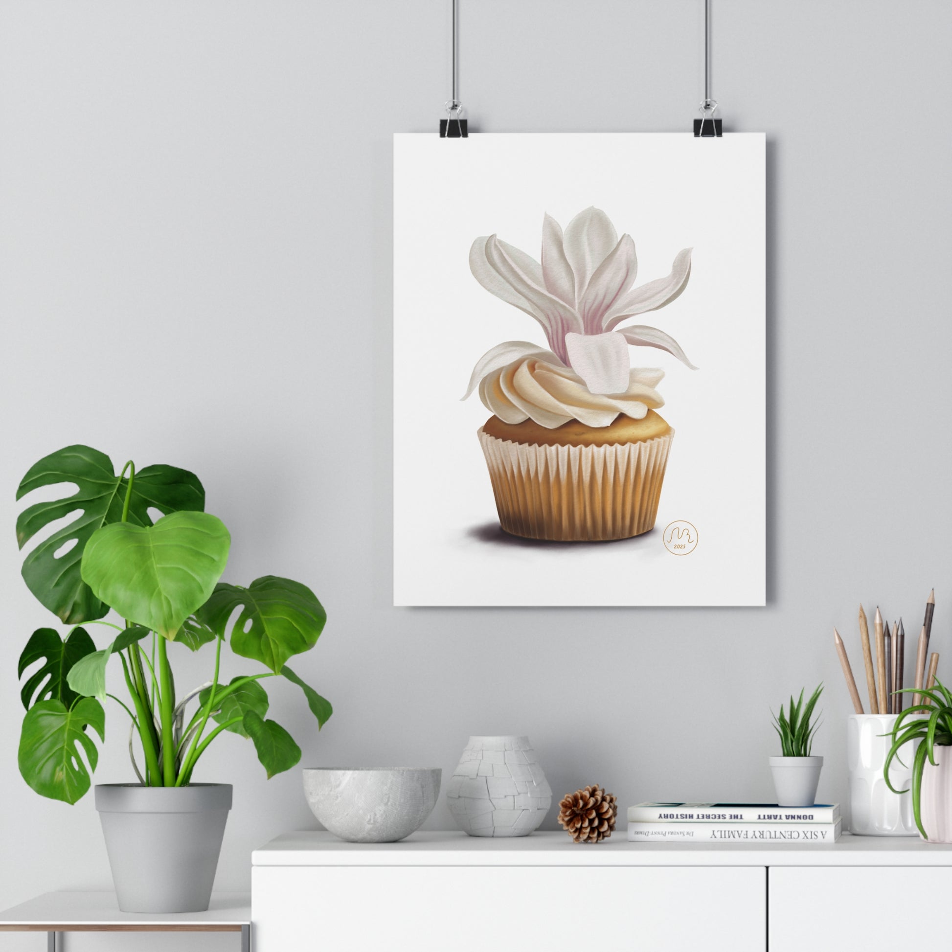 Let your walls bloom with sweetness and charm! This Magnolia Cupcake Art Print is a whimsical fusion of nature and dessert, bringing a soft, dreamy vibe to any space. A delicate magnolia blossom takes the place of icing, resting atop a golden cupcake base — a surreal design that celebrates imagination and beauty.