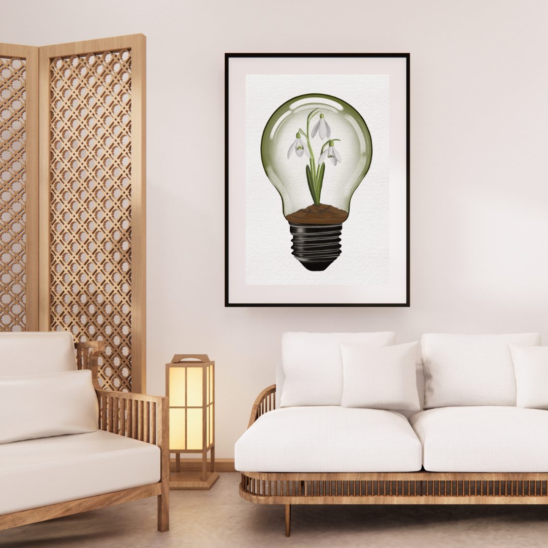 Delicate snowdrop flowers bloom from a surreal light bulb, blending botanical elegance with playful imagination. Snowdrops symbolize hope, resilience, and quiet strength - representing light in darker seasons and the gentle promise of new beginnings.